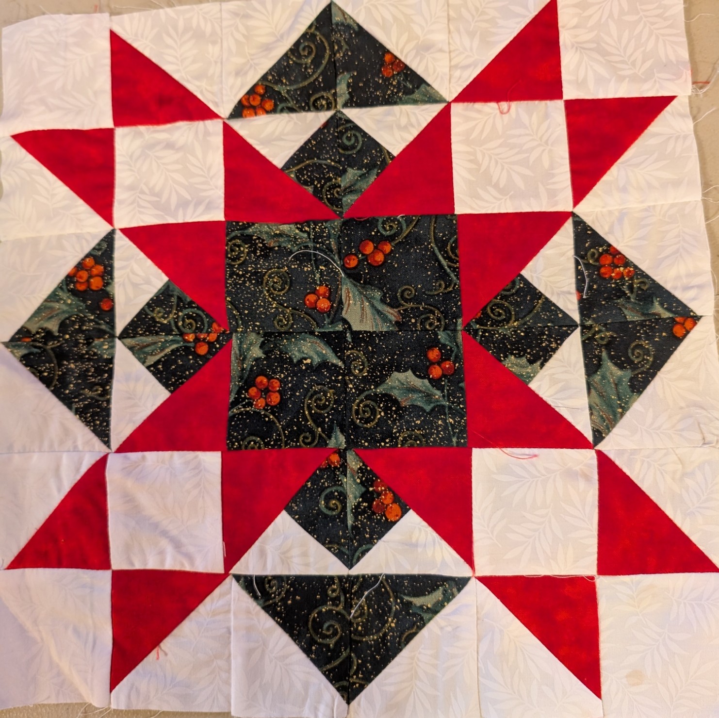 Each month a new pattern is provided to our members. They are invited to bring one or more completed blocks to our next meeting. For each block you bring, you receive a raffle ticket. A member will go home with a stack of blocks.
